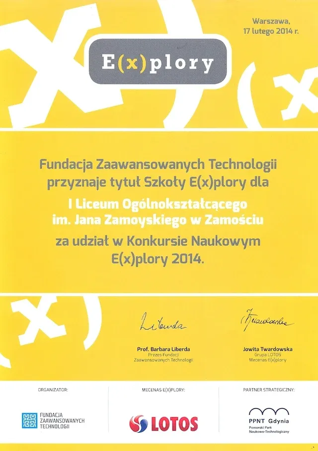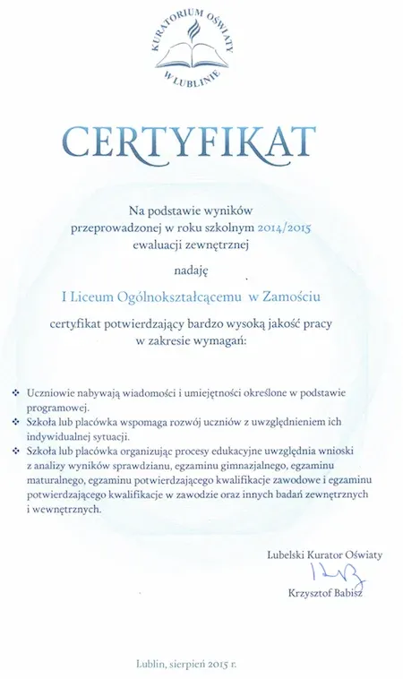 Dołączyliśmy do elitarnego grona szkół ponadgimnazjalnych z Lubelszczyzny otrzymując Certyfikat Szkoła Innowacji, który jest wyróżnieniem i jednocześnie promowaniem szkół nowoczesnych, innowacyjnych, wspierających edukację praktyczną, dbających o przyszłość swoich absolwentów. Dotychczas w trzech edycjach konkursu 49 szkół otrzymało taki certyfikat. Przedsięwzięciu od początku patronują Marszałek Województwa Lubelskiego, Prezydent Miasta Lublin oraz Lubelski Kurator Oświaty.