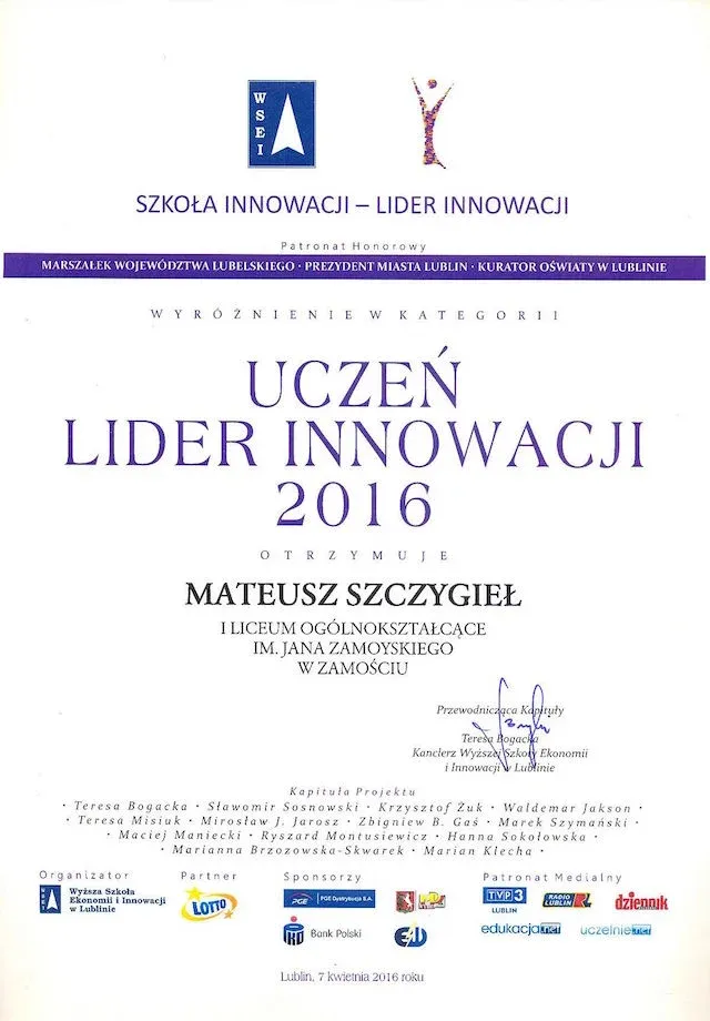 Kapituła, w skład której wchodzą przedstawiciele Wyższej Szkoły Ekonomii i Innowacji w Lublinie, władz samorządowych, Kuratorium Oświaty, szkół oraz mediów postanowiła uhonorować naszą szkołę wyróżnieniem „Szkoła – lider innowacji”, co świadczy iż dokładamy wszelkich starań aby kształcić na jak najwyższym poziomie – kształtować postawy przedsiębiorcze oraz społeczną odpowiedzialność i kreować najlepsze wzorce w dziedzinie edukacji. Wyróżnienie dla laureata konkursu w kategorii „Szkoła – lider innowacji” przyjął Dyrektor Zygmunt Kamiński.