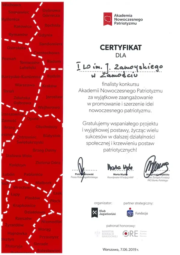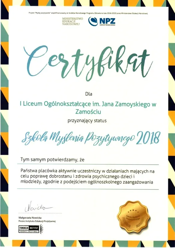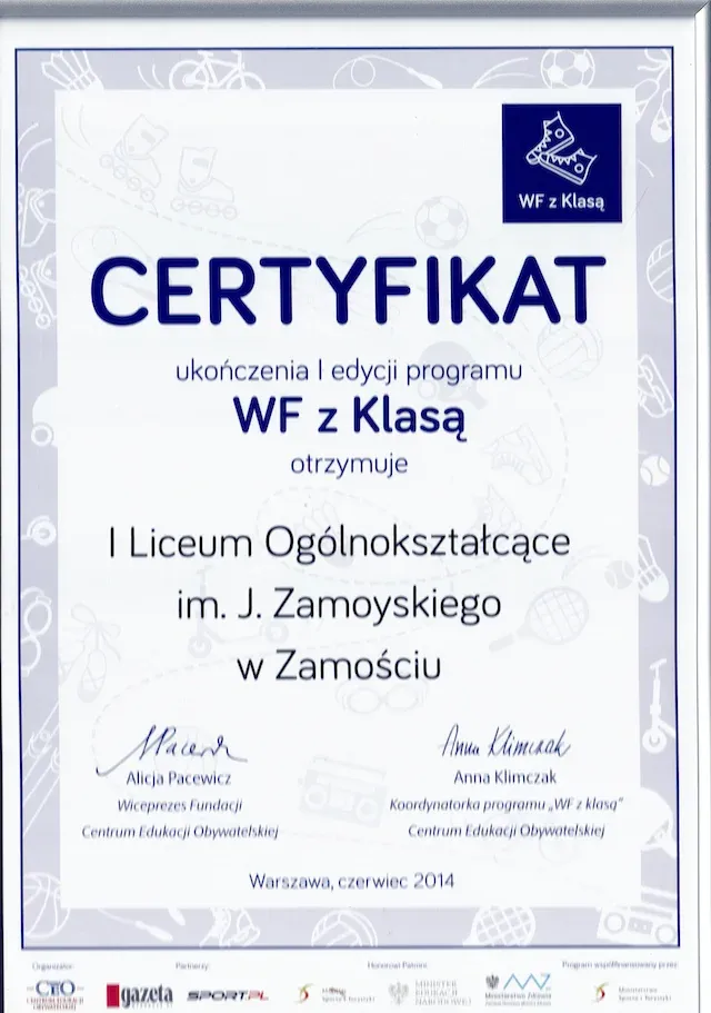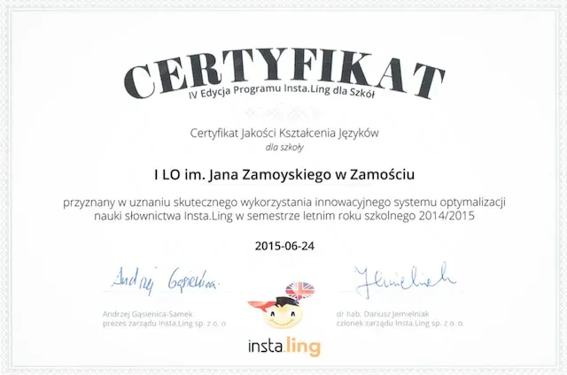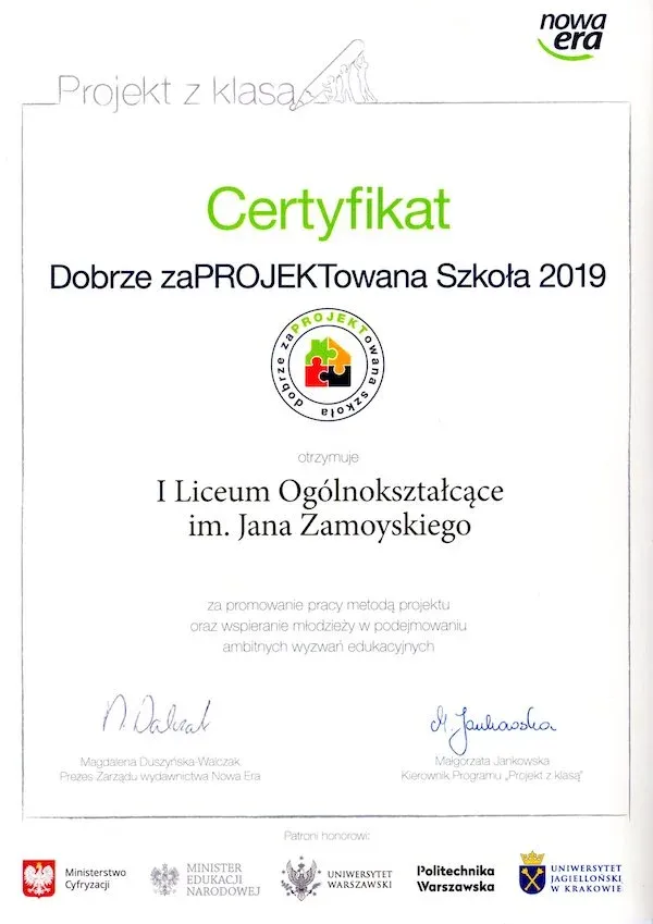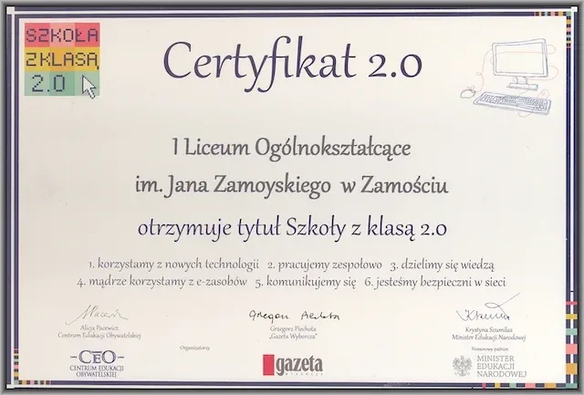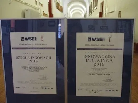 Nasze Liceum, to nie tylko szkoła z pięknymi, stuletnimi tradycjami. To także szkoła, która nie boi się nowych wyzwań i działań innowacyjnych. Co zostało potwierdzone przyznaniem certyfikatu „Szkoła Innowacji”. Tytuł ten przyznawany jest w konkursie, organizowanym przez Wyższą Szkołę Ekonomii i Innowacji w Lublinie, promującym szkoły, w których realizowane są nowatorskie pomysły, wspierana jest praktyczna edukacja, kreatywność i przedsiębiorczość uczniów, oraz podejmowane są wszelkie niestandardowe i innowacyjne działania.