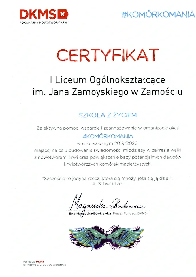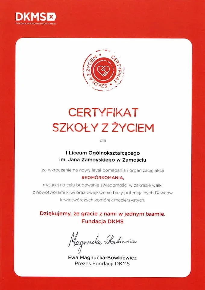 Certyfikat „Szkoła z Życiem”
